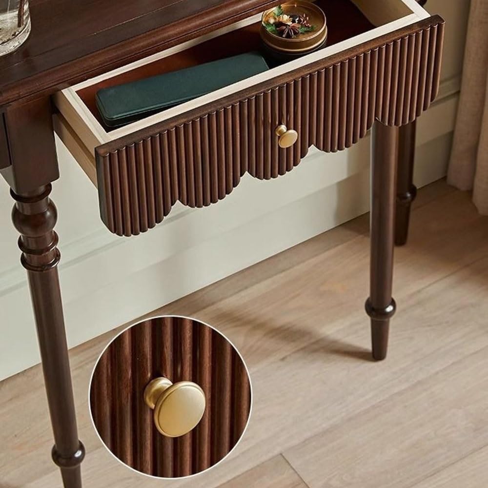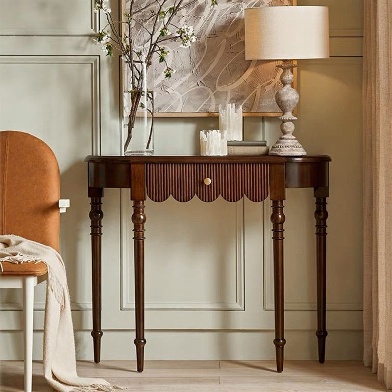 Bring timeless sophistication into your home with the Arteforma Console Table, a perfect blend of classic craftsmanship and elegant detailing. Designed in a rich walnut finish, this console features a scalloped apron with vertical grooves, accented by a single brass knob that adds a subtle touch of luxury.