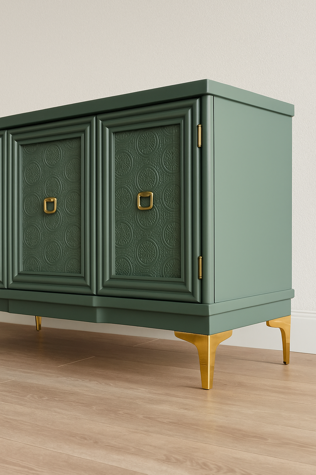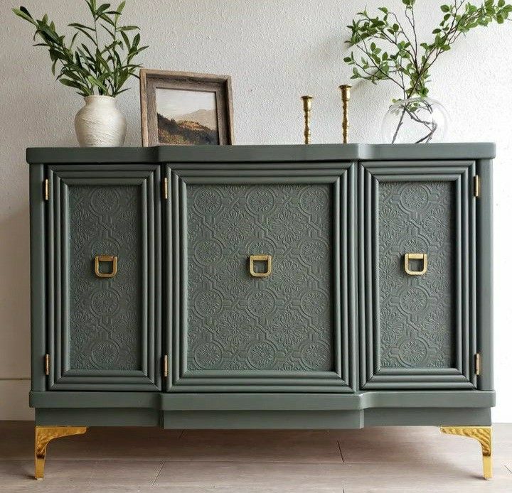 Elevate your space with The Harmony Unit, a statement cabinet that combines bold design with timeless elegance. Finished in a deep sage green, it features intricate embossed patterns across its three-panel doors, framed by sculpted molding that adds depth and sophistication. The brass square ring pulls and sleek golden legs create a striking contrast, infusing a sense of luxury into the design.