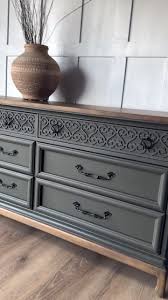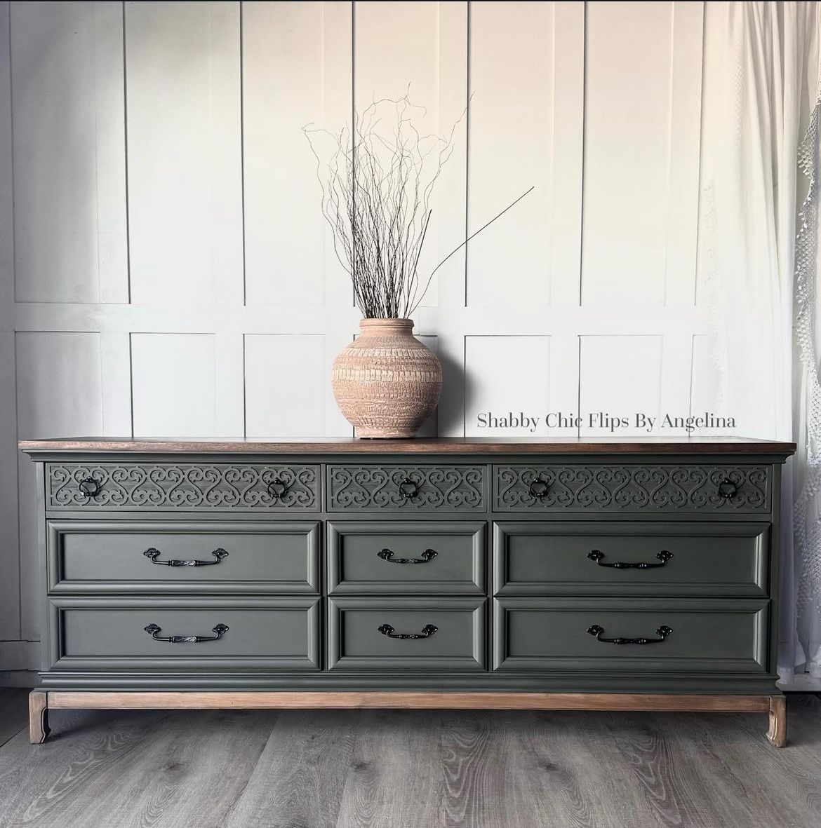 Bring timeless elegance into your home with The Harmony Unit, a stunning dresser that blends traditional artistry with modern refinement. Finished in a deep sage green, it features beautifully carved floral motifs across the top row, paired with bold, paneled drawers that highlight its classic character. The matte black ornate handles add a touch of vintage charm, while the natural wood top and base provide a balanced, earthy contrast.